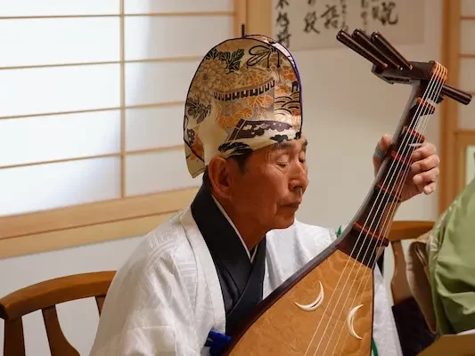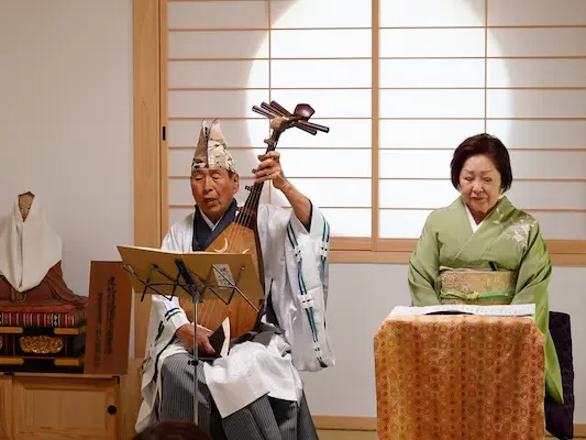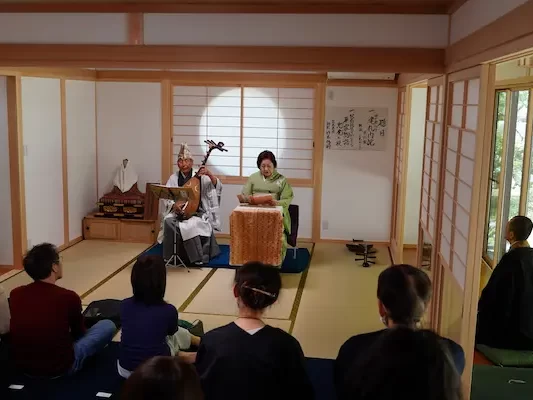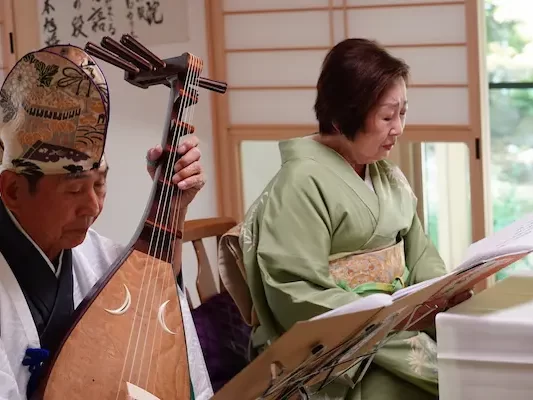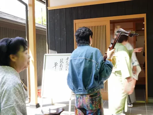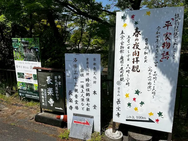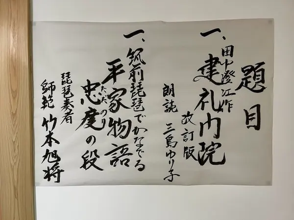 筑前琵琶でかなでる「平家物語」平家物語ゆかりの寺 長楽寺 【日時】令和7年5月3日・4日 14:00・16:00(両日とも)【場所】時宗 黄台山 長楽寺■筑前琵琶でかなでる「平家物語」琵琶演奏 竹本旭将朗読 三島ゆり子 八坂神社より少し上がった所に看板がございました。 五月晴れのとても良い天気となりました。 坂道は続きます。 まだまだ続きます。 途中、坂本龍馬・中岡慎太郎像がございました。 長い坂道を上り山門にやってきました。 会場へ向かいます。 会場入り致します。 題目 沢山の方にお越し頂きました。 背後の光は照明では無く、円窓からの外光によるものです。 琵琶演奏 竹本旭将 朗読 三島ゆり子